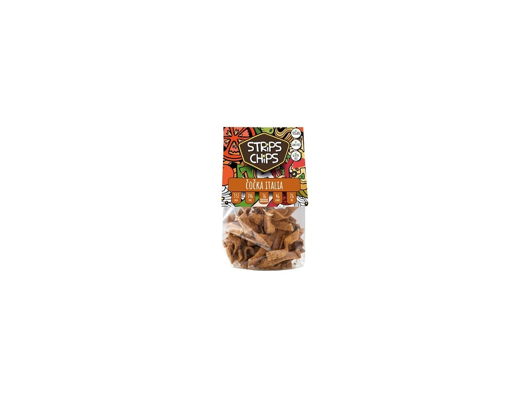 Chuť Itálie v každém křupnutí! STRiPS CHiPS Italia jsou luštěninové krekry vyrobené z čočkové mouky a ochucené směsí středomořských bylinek a rajčat. Jsou přirozeně bezlepkové, bez konzervantů, barviv, glutamátu a éček. Díky vysokému obsahu bílkovin a vlákniny zasytí a dodají energii – ideální jako zdravá svačina nebo party snack. Složení: Čočková mouka 33%, hrachová mouka 50%. řepkový olej, chia semínka. mořská sůl, cibule, rajčata, česnek, směs koření, kvasničný extrakt. Výživové údaje na 100g: energetická hodnota 1850kJ/441kcal, tuky 17,9g z toho nasycené mastné kyseliny 1,3g, sacharidy 47g z toho cukry 4,5g, vláknina 6,7g, bílkoviny 20g, sůl 2,7g EAN: 8594196640024Doplňkové parametry