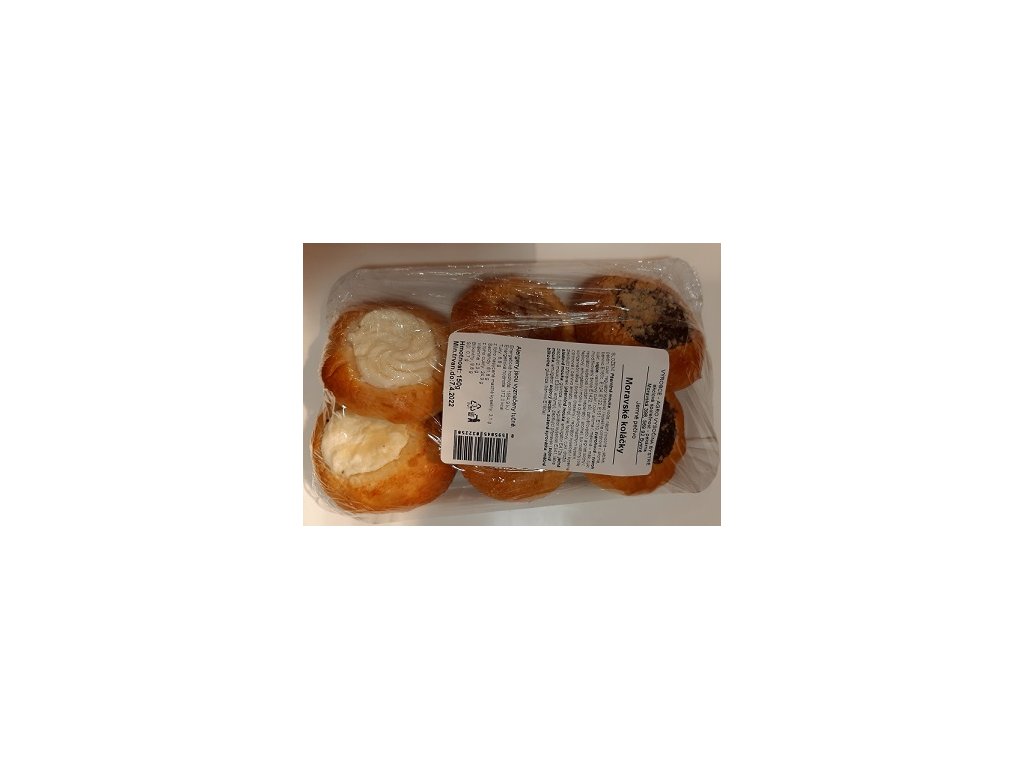 Jemné pečivo Složení: PŠENIČNÁ MOUKA, voda, náplně, tuk rostlinný (olej řepkový, emulgátory /mono a diglyceridy mastných kyselin/, konzervační látka /sorban draselný/, regulátor kyselosti /kyselina citronová/, přírodní barvivo /annato/, aroma), cukr, droždí, zlepšující přípravek )JEČNÁ SLADOVÁ MOUKA, /emulgátor E472e/, glukoza, regulátor kyselosti /fofsorečnan vápenatý/, látka zlepšující mouku /kyselina askorbová/, enzymy), zlepšující přípravek (SOJOVÁ MOUKA, glukozový sirup, SUŠENÁ SYROVÁTKA, emulgátor /sojový lecitin/, MLÉČNÁ BÍLKOVINA, barvivo /směs karotenů/), sůl Náplně: OVOCNÁ (ovocná dřeň, cukr, škrobový sirup, stabilizátor pektin, regulátor kyselosti /kyselina citrónová/, barvivo /E160c/, aroma, konzervant /benzoan sodný a sorban draselný/) TVAROHOVÁ (TVAROH, cukr, VEJCE, vanilínový cukr (cukr, vanilínové aroma), MAKOVÁ (mák, cukr, modifikovaný škrob /E1422/, sůl, zahušťvadlo /alginát sodný/, regulátor kyselosti /octan vápenatý/, aroma) EAN: 8595045032250Doplňkové parametry