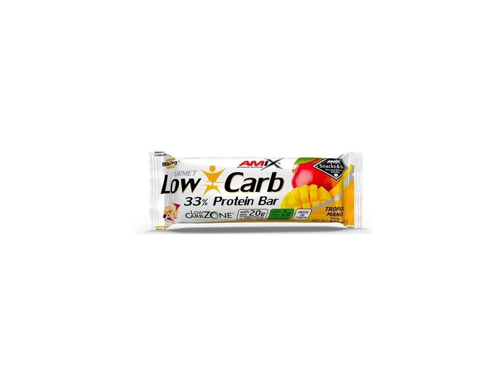 AmixTM Low-Carb 33% Protein Bar je tyčinka se sladidlem, s nízkým obsahem sacharidů, speciálně cukrů a vysokým obsahem bílkovin. Složení tropical mango: Amix™ MilkPro® Protein Blend 39,4% (mléčný bílkovinný izolát a koncentrát, CFM® syrovátkovýbílkovinný izolát a koncentrát /z mléka/); maltitolový sirup, rostlinný tuk (palmo-jádrový, palmový a bambucký olej v různých poměrech); plnidlo: polydextróza; zvlhčovadlo: glycerol; pomerančový kandovaná kůra 2,5% (pomerančová kůra, glukózový sirup, cukr, regulátor kyselosti: kyselina citrónová, konzervant: oxid siřičitý/SO2/); regulátor kyselosti: kyselina citrónová; emulgátor: sojový lecitin, aroma, barvivo: beta karoten. Upozornění na alergeny: Může obsahovat stopy vajec, lepku, korýšů, oříšků a arašídů. Výživové údaje 1 tyčinka (60g): energie 1041kJ/242kcal, tuky 10,2g z toho nasycené mastné kyseliny 8,3g, sacharidy 14,8g z toho cukry 1,8g, vláknina 5,3g, bílkoviny 20g, sůl 0,06g Nevhodné pro děti, těhotné a kojící ženy. Nepřekračujte doporučené denní dávkování. Uchovávejte mimo dosah dětí. EAN: 8594060005379Doplňkové parametry