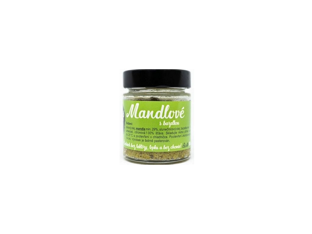 Mandlové pesto, jak už název napovídá, je ze spousty mandlí. Mandlové pesto je jemné chuti, dalo by se říci dámské. Jak ochutná, milovník mandlí ocitne se v mandlovém ráji. Mandlové pesto je výborné k těstovinám, nokům, rýži, grilované zelenině, případně do salátu. Své uplatnění najde při přípravě ryby, krůtích plátků kdy při zapečení vytvoří křupavou krustičku. Složení: extra panenský olivový olej, (MANDLE min.30%) , slunečnicový olej, bazalka min 12%, umeocet, citronová 100% šťáva. Výživové údaje na100g: energie 2643kJ/634kcal, tuky 67g z toho nasycené mastné kyseliny 8,2g, sacharidy 2g z toho cukry 1,3g, vláknina 3,9g bílkoviny 6,8g, sůl 0,01g EAN: 8594175473216Doplňkové parametry