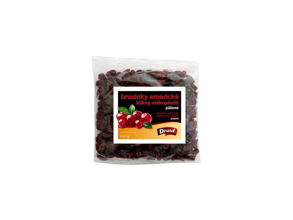 Zářivě červené bobule s lehce trpkým aroma jsou chut‘ovým požitkem a dokonale se hodí k přípravě různých pokrmů: s americkými brusinkami můžete vařit či péci, chut‘ově dolad‘ovat slaná i sladká jídla. Sušené plody jsou výborné jen tak jako malý snack, v salátu, jogurtu nebo dezertu. Brusinkovou št‘ávu mužete pít čistou, ředěnou nebo v míchaných nápojích. Použití: do kaší, müsli směsí, jogurtů, do bábovek a palačinkového těsta, do čajů, hodí se k divočině a drůbeži, do omáčky nebo posypat maso na talíři. Zabraňují tvorbě ledvinových kamenů, ledvinové kameny i rozpouštějí, pomáhají při zánětu močového měchýře, při problémech s prostatou, při problémech v těhotenství a menopauze. Pomáhají při léčbě onemocnění srdce a krevního oběhu, omezují kornatění tepen, pomáhají proti vzniku nádorů a rakoviny. Složení: brusinky, cukr, slunečnicový olej Výživové údaje na 100g: energie 1424kJ/340kcal, tuky 0,4g z toho nasycené mastné kyseliny 0,1g, sacharidy 83g z toho cukry 66g, bílkoviny 0,8g, sůl 0,01g EAN: 8595240901467Doplňkové parametry