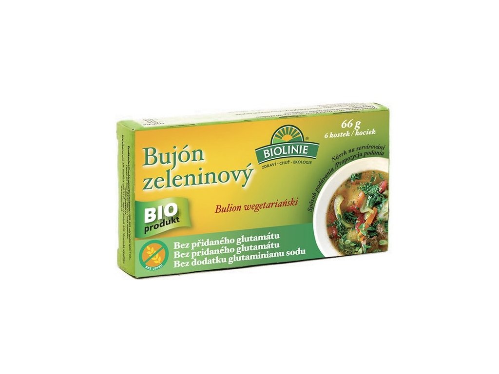 Tento bujón je vyroben výhradně ze surovin v biokvalitě. Neobsahuje glutamát sodný ani barviva, aromata a škodlivá éčka. Je proto vhodný na přípravu polévek a jiných pokrmů i pro nejmenší děti. Zeleninový bujón plnohodnotně nahrazuje na přípravu složitý zeleninový či masový vývar. Použít jej můžete do polévek, omáček, zeleninových a těstovinových pokrmů. Složení: dehydratovaný výrobek - jedlá mořská sůl, palmový olej, miso (SÓJA, rýže, pitná voda, jedlá sůl, koji), sušená zelenina v proměnlivém poměru 9,2% (cibule, CELER, mrkev, petržel, pórek), rýžová mouka, kukuřičný škrob, kvasnicový extrakt, koření. Alergeny: Výrobek obsahuje sóju a celer. Návod k přípravě: 1 kostku bujónu rozpustíme v 0,5l vroucí vody. Výživové údaje na 100g: energetická hodnota 20kJ/5kcal; tuky < 0,5g z toho nasycené mastné kyseliny 0,2g; sacharidy < 0,5g z toho cukry < 0,5g; bílkoviny < 0,5g, sůl 1,09g. EAN: 8594008916354Doplňkové parametry