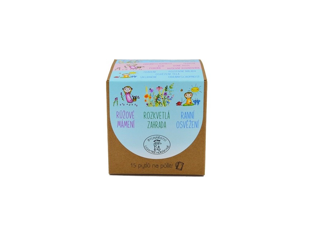 Variace porcovaných bylinkových čajů Růžové mámení, Rozkvetlá zahrada a Ranní osvěžení. Růžové mámení Složení: Růže květ, jasmín květ, citrónová tráva, malina list, jahodník list. Rozkvetlá zahrada Složení: Levandule květ, heřmánek květ, měsíček květ, jasmín květ, růže květ, lípa květ, bez černý květ, jahoda list, meduňka list. Ranní osvěžení Složení: Citrónová tráva, meduňka nať, ostružina list, ibišek květ, lípa květ, heřmánek květ, máta peprná. Hoď mě do velkého hrnku, zalij mě půllitrem vody a nechej mě koupat 10 min. Pak mě vytáhni a vychutnej si výborný čaj. EAN: 8594196390684Doplňkové parametry