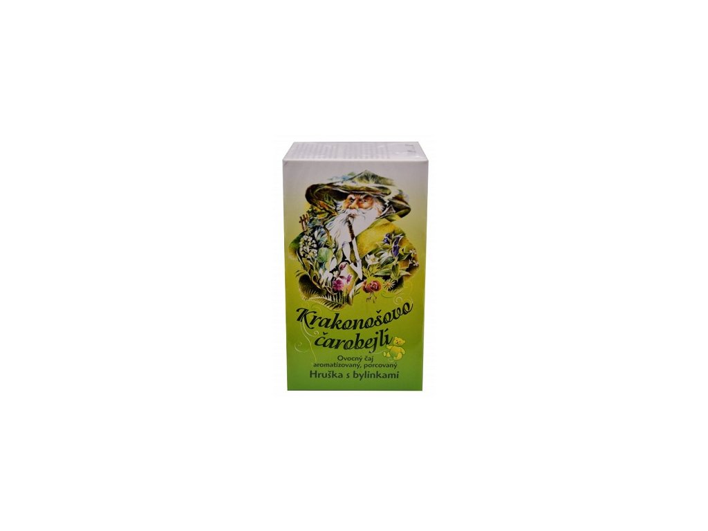 Bylinkový aromatizovaný ovocný čaj s příchutí horké hrušky doplněné o bylinky. Krakonošovo čarobejlí s vyváženou chutí a vůní ovoce je balen jako porcovaný čaj po 2g a dvaceti kusech v krásně zdobené krabičce s krkonošským motivem, který se hodí i jako drobný dárek. Čaj je vhodný doplněk běžného pitného režimu ať v zimě jako horký nápoj, nebo v létě jako ledový čaj s ovocem. Jeho příprava je stejná jako u běžného čaje, necháme sáček vylouhovat 6-8 minut ve 250 ml horké vody o 100°C. Hruškový čaj můžeme osladit medem nebo sirobem. Složení: jablko plod, hruška plod, šípek plod, ostružník list, fenykl plod, echinacea nať, vřes nať, aroma. EAN: 8594004999788Doplňkové parametry