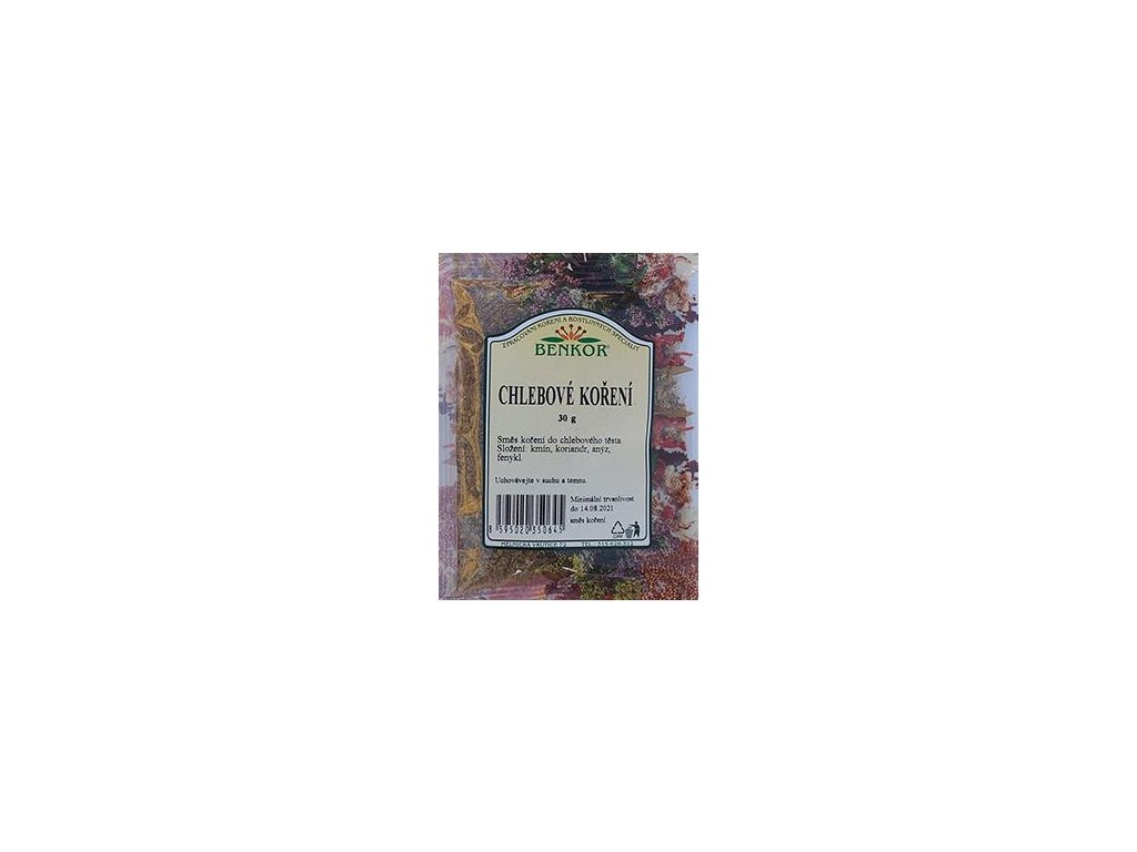 Chlebové koření je směs koření k pečení chleba v domácích pekárnách i v troubě. Neobsahuje sůl ani žádné další přísady. Vhodné pro bezlepkovou dietu. Složení: kmín, koriandr, anýz, fenykl EAN: 8595020350645Doplňkové parametry
