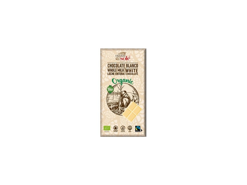 Jemná bílá čokoláda slazená přírodním třtinovým cukrem z Brazílie. Ovoněná je čistou vanilkou a jako emulgátor je použitý lecitin z bio slunečnic. Bio čokolády značky SOLÉ na sobě nesou logo FAIR TRADE. Fair trade - spravedlivý obchod - garantuje farmářům z rozvojových zemí spravedlivou odměnu a zakazuje otrockou a dětskou práci. Složení: přírodní třtinový cukr, sušené MLÉKO, kakaové máslo, emulgátor: slunečnicový lecitin, vanilka. Všechny složky pocházejí z kontrolovaného ekologického zemědělství. Může obsahovat stopy skořápkových plodů. Výživové údaje na 100g: energetická hodnota 2414kJ/578kcal, tuky 35,7g z toho nasycené mastné kyseliny 21,2g, sacharidy 58g z toho cukry 57,5g, vláknina 0g, bílkoviny 6,1g, sůl 0,05g EAN: 8411066003027Doplňkové parametry