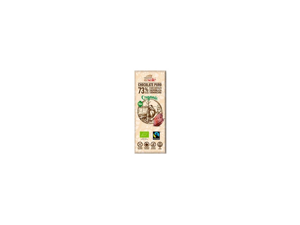 Tato malá čokoládka obsahuje vysoký podíl špičkového dominikánského bio kakaa a přírodní třtinový cukr z Brazílie. Ovoněná je pouze čistou vanilkou a neobsahuje žádné emulgátory. Bio čokolády značky SOLÉ na sobě nesou logo FAIR TRADE. Fair trade - spravedlivý obchod - garantuje farmářům z rozvojových zemí spravedlivou odměnu a zakazuje otrockou a dětskou práci. Složení: kakaová hmota, přírodní třtinový cukr, kakaové máslo, vanilka. Všechny složky pocházejí z kontrolovaného ekologického zemědělství. Obsah kakaové sušiny nejméně 73 %. Může obsahovat stopy skořápkových plodů a mléka. Výživové údaje na 100g: energetická hodnota 2338kJ/561kcal, tuky 35,9g z toho nasycené mastné kyseliny 23g, sacharidy 47,6g z toho cukry 27,1g, vlláknina 2g, bílkoviny 11,8g, sůl 0,01g EAN: 8411066002877Doplňkové parametry