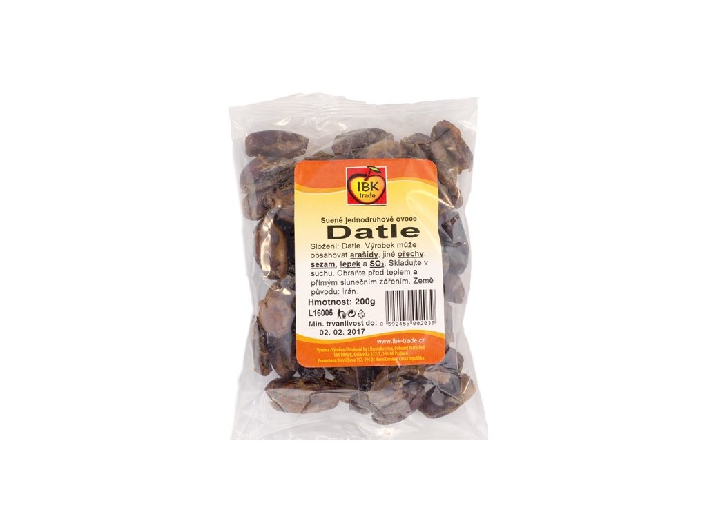 Sušené ovoce jednodruhové. Složení: datle. Skladujte v suchu. Chraňte před teplem a slunečním zářením. Výrobek může obsahovat ARAŠÍDY, OXID SIŘIČITÝ, SKOŘÁPKOVÉ PLODY nebo SEZAM. Země původu: Irán. Výživové údaje na 100g: energie 1181kJ/282kcal; tuky 0,4g z toho nasycené mastné kyseliny 0,1g; sacharidy 75,3g z toho cukry 64g; vláknina 8g; bílkoviny 2,5g; sůl 0,05g EAN: 8594184130056Doplňkové parametry