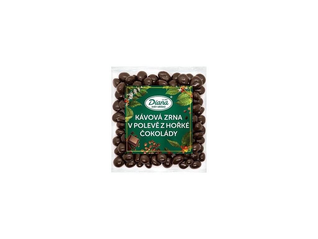 Kávová zrna se získávají z keře kávovníku arabského. Jsou typická svou silnou vůní a hořkou chutí. Obsahují alkaloid kofein, který povzbuzuje srdeční činnost a potlačuje únavu. Nejčastěji se setkáme s mletými kávovými zrny, které se používají při výrobě kávy, tradičního arabského nápoje, který se od 15. století rozšířil mimo oblast Arabského poloostrova a stal se tak oblíbeným a žádaným nápojem po celém světě. Složení: poleva z hořké čokolády 87% (cukr, kakaová hmota, rostlinný tuk palmový,kakaové máslo, syrovátka z mléka, slunečnicový lecitin E322, arabská guma, šelak E904, obsah kakaa v sušině min. 35 %), kávová zrna 13%. Produkt obsahuje mléko (laktózu) a výrobky z něj a může obsahovat skořápkové plody a výrobky z nich a jádra podzemnice olejné a výrobky z nich. Výživové údaje na 100g: energetická hodnota 2118kJ/505kcal, bílkoviny 4,5g, tuky 29,9g z toho nasycené mastné kyseliny 18g, sacharidy 57,1g z toho cukry 53,3g, vláknina 5,2g, sůl 0,2g EAN: 8596443005983Doplňkové parametry