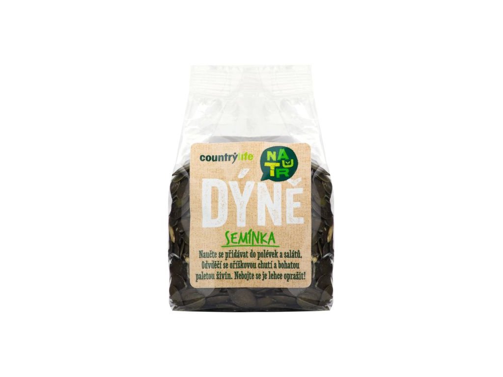 Zeleno-hnědá semínka s jemnou oříškovou chutí. Hodí se do polévek, salátů nebo k pražení. Semínka už jsou zbavená slupky a jsou vhodná ke konzumaci i samotné. Jejich výhodou je snadné skladování a dlouhodobá trvanlivost. Složení: dýňová semena. Může obsahovat stopy lepku. Výživové údaje na 100g: energetická hodnota 2465kJ/595kcal, tuky 48g z toho nasycené mastné kyseliny 8,9g, sacharidy 1,3g z toho cukry 1,3g, bílkoviny 36,9g, sůl 0,05g EAN: 8595016597023Doplňkové parametry