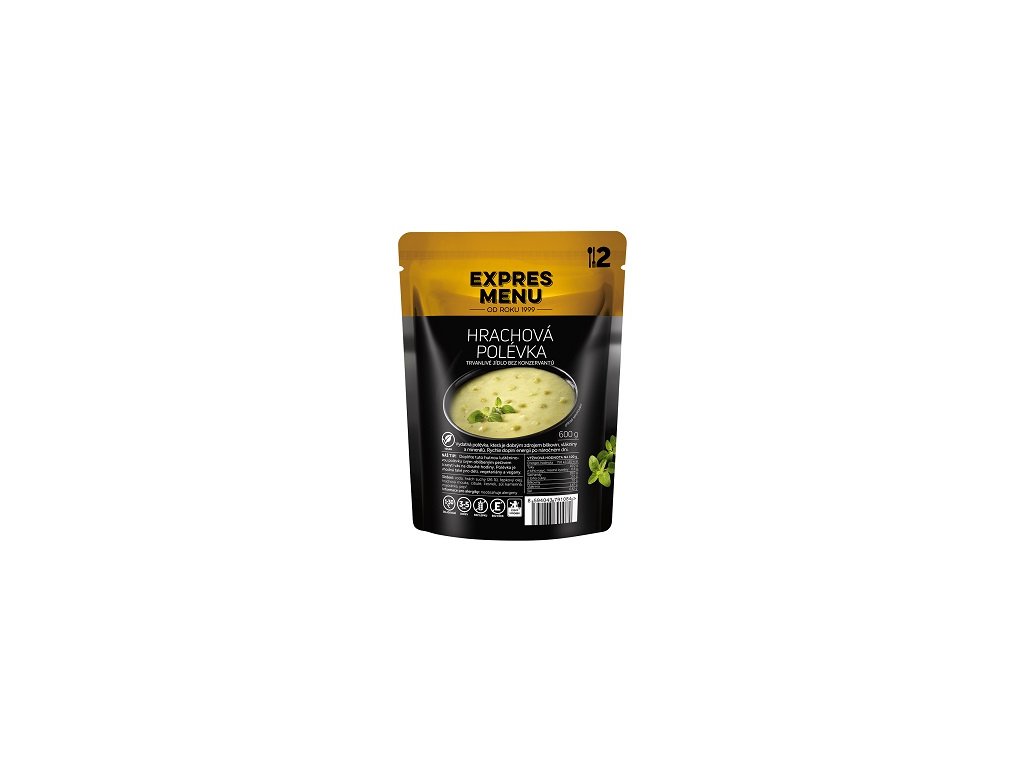 Hustá polévka ze sušeného zeleného hrachu s cibulí, česnekem a majoránkou. Složení: voda, hrách suchý 26%, řepkový olej, hrachová mouka, cibule, česnek, sůl (jedlá kamenná sůl, jodičnan draselný), majoránka, pepř. POTRAVINA BEZ LEPKU Doba spotřeby jídel EXPRES MENU je 10 let. Produkty jsou již zcela uvařené a tepelně zpracované. Jejich příprava tedy spočívá pouze v ohřevu (samozřejmě se dají jíst i za studena). Nemusíte přidávat žádnou vodu ani jídlo převářet. Jídlo si tak připravíte během pár minut a můžete podávat. Ohřát můžete několika způsoby - Vložte uzavřený sáček do hrnce s horkou vodou (nebo do rychlovarné konvice) nechte cca 10 min prohřát a po otevření servírujte přímo na talíř. - Sáček vyprázdněte přímo do hrnce (nebo pánvičky) a ohřívejte cca 5 min. - Přendejte jídlo ze sáčku do vhodné nádoby a ohřívejte cca 3 min v mikrovlnné troubě. Výživová hodnota na 100g: energetická hodnota 758kJ/181kcal, tuky 10g z toho nasycené mastné kyseliny 0,8g, sacharidy 18g z toho cukry 2g, bílkoviny 7g, sůl 0,82g EAN: 8594043791084Doplňkové parametry