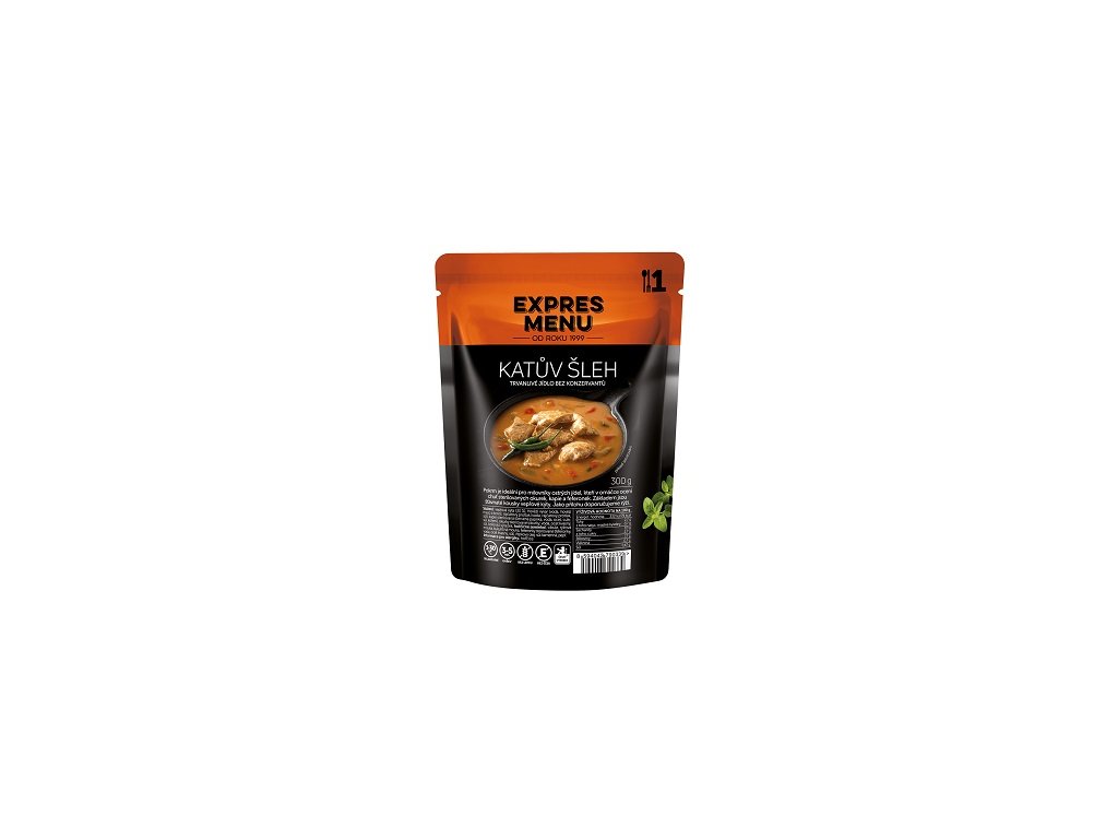 Směs vepřového masa s cibulí, sterilovanými okurkami, kapií a feferonkami. POTRAVINA BEZ LEPKU Doba spotřeby jídel EXPRES MENU je 10 let. Složení: vepřová kýta 33%, rajský protlak (voda, rajčatový protlak, sůl), rýžová mouka, kukuřičná mouka, okurky sterilované (okurky, voda, ocet kvasný, sůl, kořenící výtažek, HOŘČIČNÉ SEMÍNKO), kapie sterilovaná (červená paprika, voda, ocet, cukr, sůl, koření), feferonky sterilované (feferonky, voda, ocet kvasný, sůl), cibule, řepkový olej, sůl (jedlá kamenná sůl, jodičnan draselný), pepř. Produkty jsou již zcela uvařené a tepelně zpracované. Jejich příprava tedy spočívá pouze v ohřevu (samozřejmě se dají jíst i za studena). Nemusíte přidávat žádnou vodu ani jídlo převářet. Jídlo si tak připravíte během pár minut a můžete podávat. Ohřát můžete několika způsoby - Vložte uzavřený sáček do hrnce s horkou vodou (nebo do rychlovarné konvice) nechte cca 10 min prohřát a po otevření servírujte přímo na talíř. - Sáček vyprázdněte přímo do hrnce (nebo pánvičky) a ohřívejte cca 5 min. - Přendejte jídlo ze sáčku do vhodné nádoby a ohřívejte cca 3 min v mikrovlnné troubě. Výživová hodnota na 100g: energetická hodnota 535kJ/128kcal, tuky 7,3g z toho nasycené mastné kyseliny 3,5g, sacharidy 9g z toho cukry 1,8g, bílkoviny 5,6g, sůl 1,1g EAN: 8594043790339Doplňkové parametry