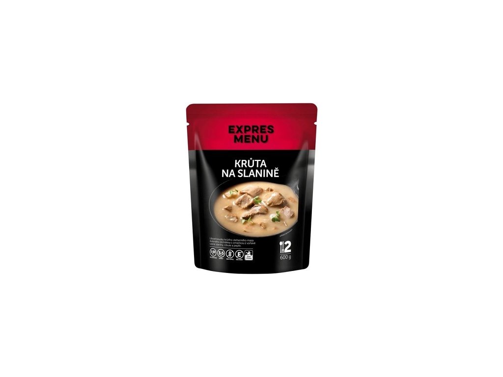 Libové kousky krůtího stehenního masa dušeného doměkka s omáčkou z voňavé uzené slaniny, cibule a pepře. Složení: krůtí stehenní maso (31%), drůbeží vývar (voda, drůbeží maso a kosti), uzená slanina (vepřové sádlo) (5%), cibule, rýžová mouka, kukuřičná mouka, sůl kamenná, pepř Výživové údaje na 413kJ/98kcal, tuky 5,6g z toho nasycené mastné kyseliny 1,9g, sacharidy 3,9g z toho cukry 0,4g, bílkoviny 9g, vláknina 0,2g, sůl 0,8g EAN: 8594043790117Doplňkové parametry