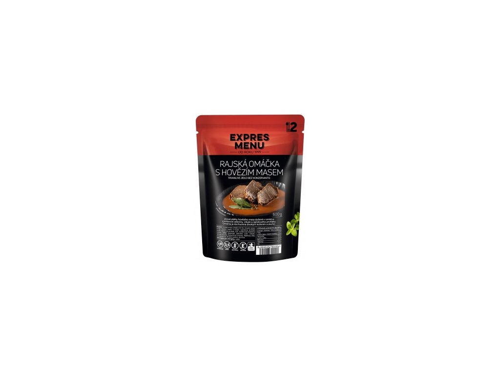 Libové plátky hovězího masa dušené v omáčce z kořenové zeleniny, cibule a rajčatového protlaku. Omáčka je dochucena divokým kořením a skořicí. POTRAVINA BEZ LEPKU Doba spotřeby jídel EXPRES MENU je 10 let. Složení: hovězí maso přední 31%, voda, rajský protlak (voda, rajčatový protlak, sůl), cibule, kořenová zelenina (mrkev, CELER, pastinák, petržel) rýžová mouka, kukuřičná mouka, řepkový olej, cukr, citron, sůl (jedlá kamenná sůl, jodičnan draselný), divoké koření. Výživová hodnota na 100g: energetická hodnota 469kJ/112kcal, tuky 3,2g z toho nasycené mastné kyseliny 1,03g, sacharidy 12,1g z toho cukry 6,8g, bílkoviny 8,5g, sůl 0,9g Produkty jsou již zcela uvařené a tepelně zpracované. Jejich příprava tedy spočívá pouze v ohřevu (samozřejmě se dají jíst i za studena). Nemusíte přidávat žádnou vodu ani jídlo převářet. Jídlo si tak připravíte během pár minut a můžete podávat. Ohřát můžete několika způsoby - Vložte uzavřený sáček do hrnce s horkou vodou (nebo do rychlovarné konvice) nechte cca 10 min prohřát a po otevření servírujte přímo na talíř. - Sáček vyprázdněte přímo do hrnce (nebo pánvičky) a ohřívejte cca 5 min. - Přendejte jídlo ze sáčku do vhodné nádoby a ohřívejte cca 3 min v mikrovlnné troubě. EAN: 8594043790490Doplňkové parametry