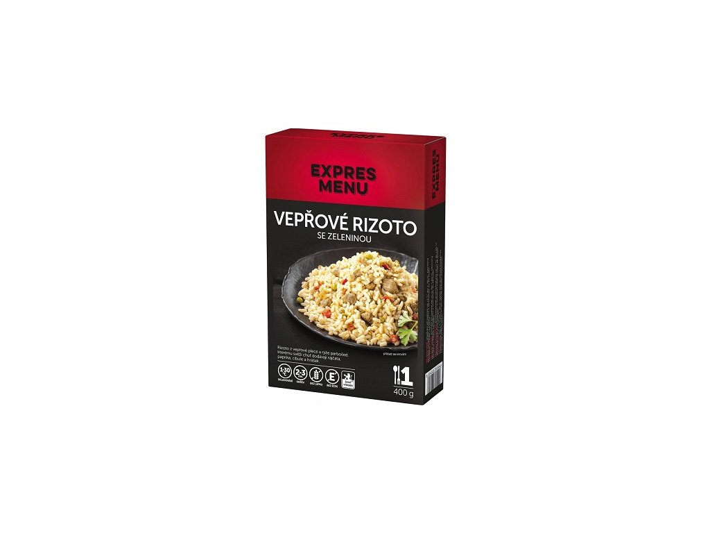 Rizoto z vepřové plece a rýže parboiled, kterému svěží chuť dodávají rajčata, paprika, cibule a hrášek. Složení: rýže parboiled 50%, vepřové maso 30%, lečo 15% (paprika, rajče, cibule), hrášek, cibule, olej řepkový, sůl kamenná, pepř. Výživové údaje na 100g: energetická hodnota 796kJ/189kcal, tuky 8,1g z toho nasycené mastné kyseliny 1,3g, sacharidy 20,6g z toho cukry 0,4g, bílkoviny 8,5g, vláknina 0,6g, sůl 0,8g EAN: 8594043795594Doplňkové parametry