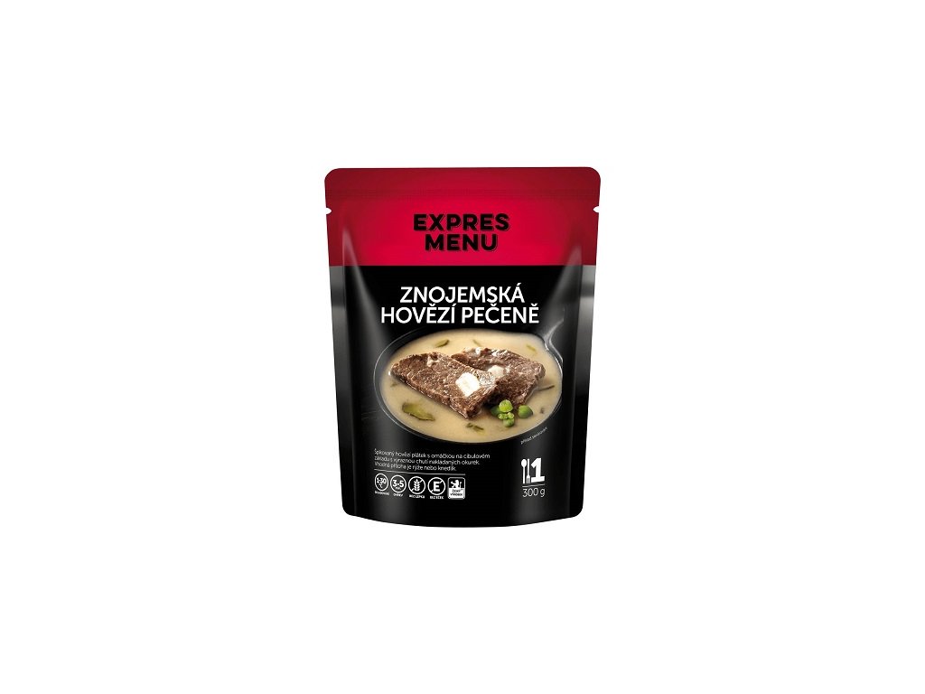 Špikovaný hovězí plátek s omáčkou na cibulovém základu s výraznou chutí nakládaných okurek. Vhodná příloha je rýže nebo knedlík. Složení: hovězí maso zadní 33%, hovězí vývar (voda, hovězí maso a kosti), cibule, okurky sterilované (okurky, voda, ocet kvasný, sůl, kořenící výtažek, HOŘČIČNÉ SEMÍNKKO), uzená slanina (vepřové sádlo), řepkový olej, rýžová mouka, kukuřičná mouka, sůl kamenná, pepř. Výživové údaje na 100g: energetická hodnota 353kJ/84kcal, tuky 5,6g z toho nasycené mastné kyseliny 0,5g, sacharidy 3,8g z toho cukry 0,4g, bílkoviny 5,5g, vláknina 0,1g, sůl 1g EAN: 8594043790360Doplňkové parametry