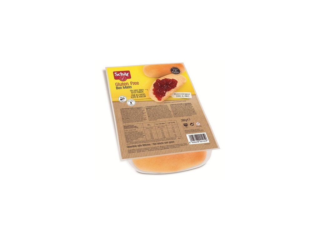 Bezlepkové sladké rohlíky Bon Matin 4x50g. Složení:rýžová mouka, kukuřičný škrob, voda, cukr, VEJCE, rostlinný margarín, rýžový škrob, glukozový sirup, guarová guma, kyselina citronová. Výživové údaje ve 100g: energie 1236kJ/293kcal, bílkoviny 3,4g, sacharidy 52g z toho cukry 14g, tuky 7,3g z toho nasycené mastné kyseliny 3,7g, vláknina 3g, sůl 0,8g EAN: 8008698001059Doplňkové parametry