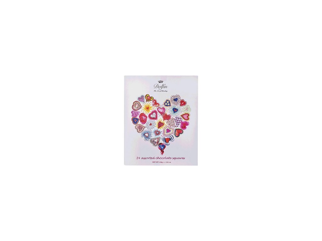 Dárkový box čokoládových čtverečků Dolfin s designem srdíček. Obsah kakaové sušiny min.: 60% 70%. Obsah mléčné sušiny min.: 38% Složení: kakaová hmota, cukr, kakaové máslo, odtučněný kakaový prášek, sušené plnotučné mléko,nugát (lískové oříšky, cukr), káva, emulgátor: sojový lecitin, přírodní vanilkové a pomerančové aroma. Alergeny: mléčná i hořká - obsahuje mléko, lískové ořechy a sójový lecitin. Může obsahovat stopy mléka, lepku, jiných skořápkových plodů a vajec. Výživové údaje na 100g: energetická hodnota2249kJ/537kcal, tuky 35g z toho nasycené mastné kyseliny 21g, sacharidy 46g z toho cukry 42g, vláknina 7g, bílkoviny 7g, sůl 0,09g. EAN: 5413415905702Doplňkové parametry