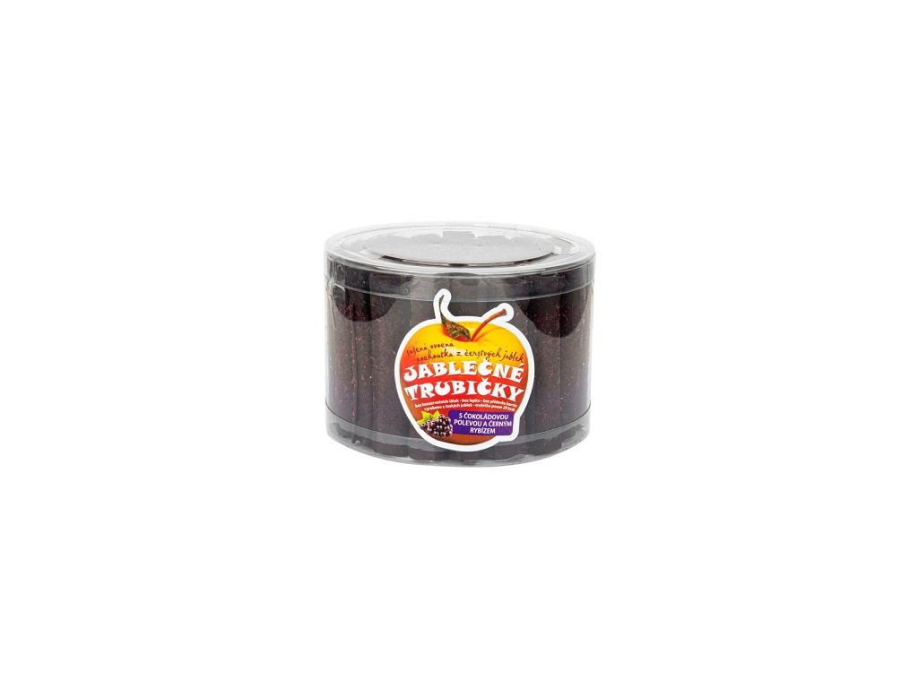 Ovocná pochoutka z čerstvé jablečné dřeně s čokoládovou polevou a černým rybízem. Vysoký obsah vlákniny. Bez lepku a konzervantů. Složení: jablečná dřeň 71%, černorybízový koncentrát 8%, cukrářská poleva tmavá 20% (cukr, plně ztužený rostlinný tuk RSPO-MB (palmojádrový), kakaový prášek se sníženým obsahem tuku, emulgátor (SÓJOVÝ lecitin), aroma, kokos 1%. Může obsahovat stopy mléka a skořápkových plodů. Alergeny: Sója Výživové údaje na 100g: energetická hodnota 1609kJ/382kcal, tuky 10,7g z toho nasycené mastné kyseliny 9,2g, sacharidy 65g z toho cukry 65g, bílkoviny 2,6g, sůl 0,01g EAN: 8594024520122Doplňkové parametry