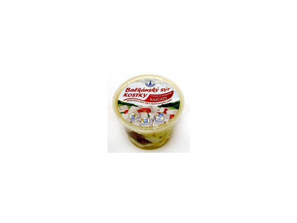 Balkánský sýr patří mezi měkké bílé sýry v solném nálevu. Je vyráběn z pasterovaného kravského mléka s nalévanou vrstvenou skladbou hmoty, s křehkou konzistencí. Celkový obsah sušiny je 42%, tuku v sušině je 48% a obsah soli je 5 - 7 %. Balkánský sýr je bílý sýr, který se řadí mezi přírodní sýry typu Feta v solném nálevu. Sýr se vyznačuje čistou mléčnou chutí, výrazně slanou, která stářím sýra přechází do vyvinuté sýrové chuti. Na řezu má sýr stejnoměrnou barvu, se štěrbinami a kavernami. Jeho konzistence je stejnorodá v celé hmotě sýra, měkká, drobivá, dobře se krájí. Sýr je určen k přímé spotřebě, jako příloha, doplněk lahůdkářských pokrmů i k dalšímu kulinářskému využití. Kostičky se sušenými rajčaty jsou ideální přílohou k vínu. Složení: Sýr: mléko, sůl (max. 5%), mlékárenské kultury, mikrobiální syřidlo. Nálev: slunečnicový olej, kapari, oregano, chili paprika, česnek. Sušená rajčata. Výživové údaje na 100g výrobku: energetická hodnota 1120kJ/270 kcal; tuky 22g z toho nasycené mastné kyseliny 13g; sacharidy 3g z toho cukry 3g; bílkoviny 15g; sůl 5g EAN: 8594009130674 TENTO PRODUKT NELZE POSÍLAT PŘEPRAVNÍ SLUŽBOU, VYŽADUJE CHLAZENÉ PROSTŘEDÍ, ALE LZE VYZVEDNOUT NA PRODEJNĚ NEBO VYUŽÍT NAŠEHO ROZVOZU ŽĎÁR A OKOLÍ.Doplňkové parametry