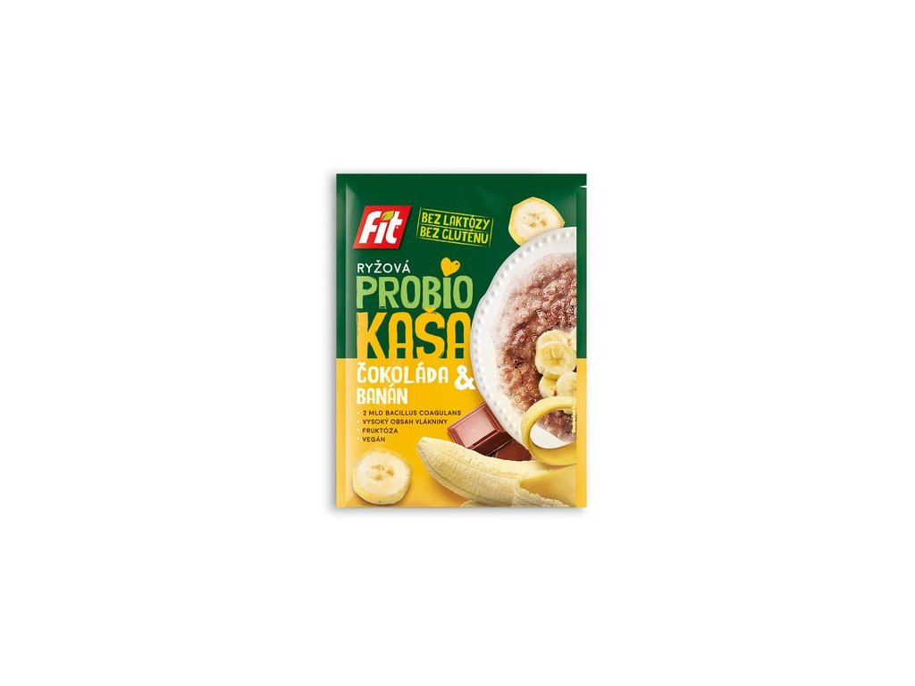 Sypká směs z obilovin pro přípravu rýžové kaše s čokoládou, s vysokým obsahem vlákniny a s probiotickými bakteriemi Bacillus coagulans. Složení: rýžová mouka 40%, kukuřičná vláknina 34,6%, fruktóza 9,5%, kukuřičný škrob, čokoláda 3% (kakaová hmota, cukr, dextrosa, emulgátor slunečnicový lecitin), kakaový prášek se sníženým obsahem tuku, banán zbavený vody vymrazením 2%, jedlá sůl, aroma, Bacillus coagulans Výživové údaje na 100g: energetická hodnota 1305kJ/311kcal, tuky 1,6g z toho nasycených 0,7g, sacharidy 55g z toho cukry 13g, bílkoviny 3,2g, vláknina 32g, sůl 0,48g EAN: 8595054906566Doplňkové parametry