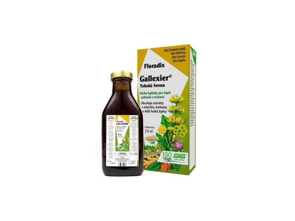 Gallexier obsahuje 10 hořkých bylin, které v naší moderní stravě někdy chybí a již po staletí je znám jejich pozitivní vliv na trávicí trakt a lidský organismus. Artyčok, pampeliška, kurkuma, zázvor a kardamon pomáhají podporovat správné trávení. Kromě toho pampeliška přispívá k normální funkci střevního traktu a ve spojení s kurkumou povzbuzuje chuť k jídlu. Gallexier napomáhá lepšímu trávení díky intenzivnější produkci távicích šťáv, zmírňuje pocit plnosti a působí pozitivně proti nadýmání. Gallexier podporuje trávení těžkých a tučných jídel a pomáhá tak zmírnit zažívací potíže. Složení: Vodný extrakt z (75%): listů artyčoku, listů pampelišky, kořene hořce, kořene kurkumy, nati řebříčku, kořene zázvoru, plodu fenyklu, květu heřmánku, kůry pomeranče, listu vachty trojlisté, plodu kardamomu, nati ostropestřece. Fruktózový sirup. Návod k použití: Před použitím lahvičku dobře protřepejte. Používejte přiloženou odměrku. Děti od 12 let a dospělí: 20ml denně před jídlem nebo po jídle. Nepřekračujte doporučené denní dávkování uvedené na obale. Doplňky stravy neslouží jako náhrada pestré a vyvážené stravy a zdravého životního stylu. Upozornění: Nepijte přímo z lahve. Výrobek neobsahuje alkohol ani chemické konzervační látky. Aby se zabránilo kontaminaci obsahu, lahvičku po každém použití pečlivě uzavřete, uchovávejte ve svislé poloze v chladničce. Po otevření spotřebujte do 4 týdnů. Uchovávejte mimo dosah malých dětí. Uchovávejte v původním obalu na chladném suchém místě (15-25°C). EAN: 4004148017063Doplňkové parametry