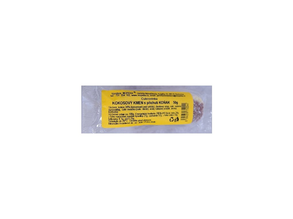 Kokosový kmen s příchutí koňaku Složení: kokos 34%, škr. sirup, cukr, suš. SYROVÁTKA, cukr moučka (cukr, škrob), voda, kakaový prášek, aroma, kurkuma. Výživové údaje na 100g: energetická hodnota 1901kJ/451kcal; tuky 24g z toho nasycené mastné kyseliny 21g, sacharidy 57g z toho cukry 33g, bílkoviny 4,1g; sůl 0,15g EAN: 8594059750044Doplňkové parametry
