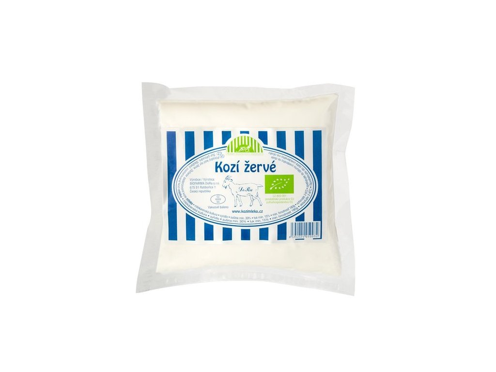 Sýr přírodní. Kozí žervé z farmy DoRa je certifikovaný výrobek pocházející z ekologického zemědělství. Surovinou je pasterované kozí mléko nejvyšší kvality vyprodukované na ekologické farmě. Pomazánkový sýr z kozího mléka má jemnou lahodnou chuť a je zdrojem snadno vstřebatelného vápníku. Složení bílkoviny je odlišné od bílkoviny kravské, a proto jsou sýry z kozího mléka vhodné pro spotřebitele, kteří trpí alergií na kravskou bílkovinu. Je celkově lépe stravitelný. Pravidelná konzumace posiluje imunitní systém. Složení: pasterované kozí MLÉKO, mlékárenská kultura, syřidlo, sušina min. 30%, tuk min. 30%. Výživové údaje na 100g: energetická hodnota 954kJ/230kcal, tuky 18g z toho nasycené mastné kyseliny 12g, sacharidy 2,3g z toho cukry_1,6g, bílkoviny 14g, sůl 0,1g, vláknina 0g EAN: 8594024050032 TENTO PRODUKT NELZE POSÍLAT PŘEPRAVNÍ SLUŽBOU, VYŽADUJE CHLAZENÉ PROSTŘEDÍ, ALE LZE VYZVEDNOUT NA PRODEJNĚ NEBO VYUŽÍT NAŠEHO ROZVOZU ŽĎÁR A OKOLÍ.Doplňkové parametry
