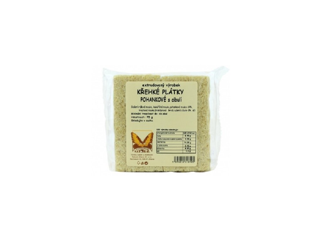 Extrudovaný výrobek. Složení: rýžová mouka, kukuřičná mouka, pohanková mouka - 19%, hrachová mouka, bramborový škrob, sušená cibule - 2%, sůl Výživové údaje na 100g: energetická hodnota 1428kJ/342kcal; tuky 2,5g z toho nasycené mastné kyseliny 0,50g; sacharidy 74,20g z toho cukry 0,90g; bílkoviny 8,8g, sůl 1,1g EAN: 8594010318405Doplňkové parametry