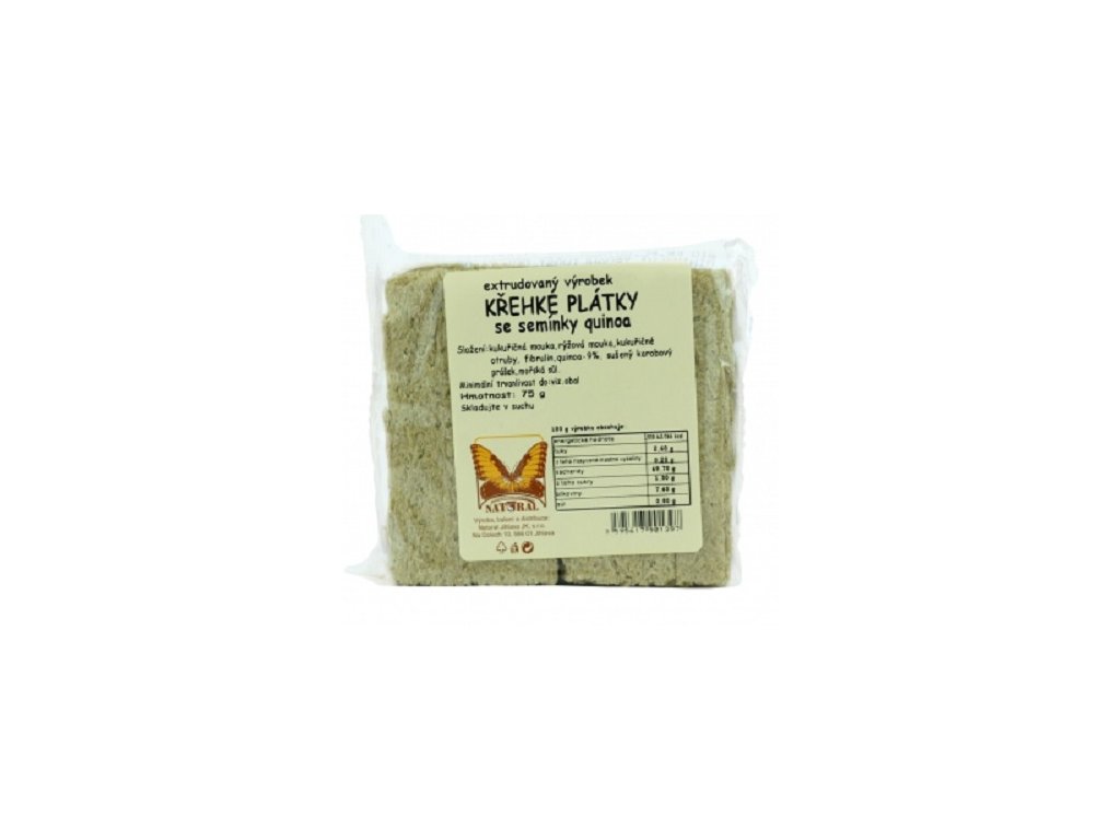 Exrudovaný výrobek. Složení: kukuřičná mouka, rýžová mouka, kukuřičné otruby, fibrulin, quinoa - 9%, sušený karobový prášek, mořská sůl. Výživové údaje na 100g: energetická hodnota 1530kJ/366kcal; tuky 2,6g z toho nasycené mastné kyseliny 0,20g; sacharidy 69,7g z toho cukry 1,30g; bílkoviny 7,60g; sůl 0,80g EAN: 8595617901397Doplňkové parametry