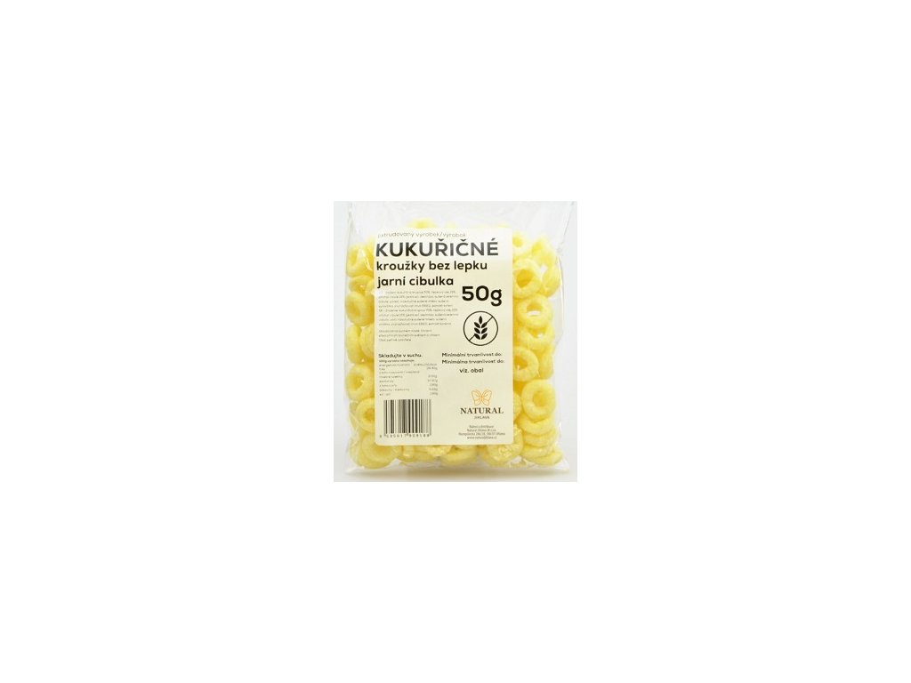 Kukuřičné kroužky s příchutí jarní cibulky bez lepku. Složení: kukuřičná krupice 70%, řepkový olej 15%, příchuť cibule 15% (jedlá sůl, dextróza, sušená zelenina (cibule, pórek), nízkotučné sušené mléko, sušená syrovátka, zvýrazňovač chuti E621), extrakt koření. Výživové údaje na 100g: energetická hodnota 2140kJ/512kcal, tuky 29,43g z toho nasycené mastné kyseliny 2g, sacharidy 57,97g z toho cukry 1,6g, bílkoviny 5,22g, sůl 1,8g EAN: 8595617909188Doplňkové parametry