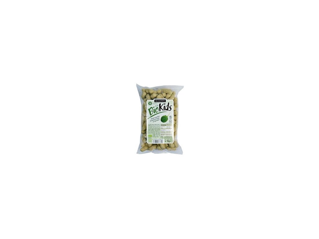 Dětské kukuřičné křupky se špenátem. Složení: kukuřice 95% (mouka a / nebo krupice), dehydratovaná špenát 5%. Z ekologického zemědělství. Bez lepku. Výživové údaje na 100g: energetická hodnota 1692kJ/403kcal; tuky 1,8g z toho nasycené mastné kyseliny 0,3g; sacharidy 85,2g z toho cukry 0,9g; bílkoviny 2,6g; vláknina 4,1g; sůl <0,1g EAN: 8588004638846Doplňkové parametry