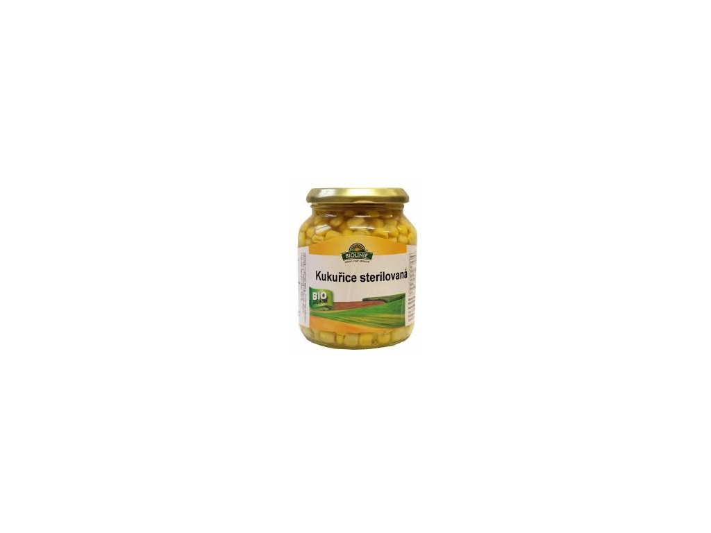 Kukuřice. Sterilovaná zelenina z ekologického zemědělství ve slaném nálevu. Složení: kukuřice 68%, pitná voda, jedlá mořská sůl, citrónová šťáva. Výživové údaje na 100g: energetická hodnota 274kJ/66 kcal; tuky 1,5g z toho nasycené mastné kyseliny 0,4g; sacharidy 10g z toho cukry 7g, vláknina 4,3g, bílkoviny 3g, sůl 0,53g EAN: 8595582401038Doplňkové parametry