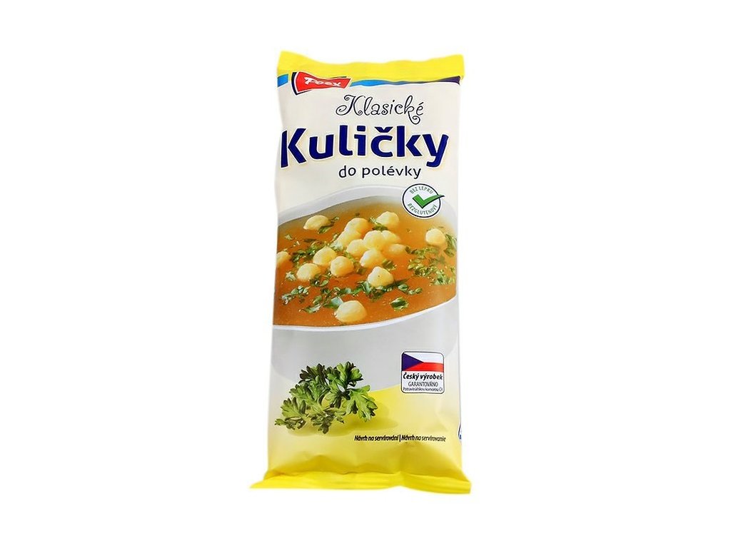 Kuličky do polévky bez lepku. Složení: kukuřičná krupice 55%, slunečnicový olej, kukuřičná mouka 16%, sušené odstředěné mléko, jedlá sůl, paprika sladká a pálivá, kvasnicový extrakt, sušená červená řepa, sušená mrkev. Výrobek může obsahovat stopy arašídů, skořápkových plodů, obilovin obsahujících lepek (lepek max. 20 mg/kg), sóji a sezamu. Výživové údaje na 100g: energie 2210kJ/530kcal; tuky 31g z toho nasycené mastné kyseliny 3,4g; sacharidy 54g z toho cukry 1,5g; vláknina 3,6g; bílkoviny 6,2g; sůl 1,0g EAN: 8594000739012Doplňkové parametry