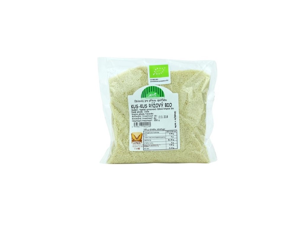 Obiloviny pro přímou spotřebu, kus kus rýžový bio.Složení: tepelně zpracovaná rýžová krupice bio