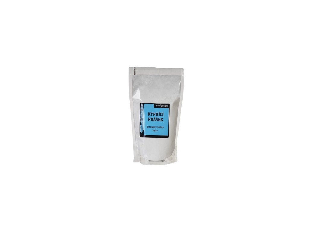 Kypřící prášek do pečiva. Obsahuje vinný kámen, jehož krystalky najdete v sudech od vína, běžnou jedlou sodu a bio kukuřičný škrob. Je vhodný i do bezlepkového pečiva. Na 500g sypkých surovin použijeme 3lžičky (17g) prášku, těsto vložíme co nejrychleji do trouby. Složení: bio kukuřičný škrob, regulátor kyselosti vinný kámen neboli hydrogenvinan draselný, kypřící látka jedlá soda neboli hydrogenuhličitan sodný. 100% složek zemědělského původu bio. Výživové údaje na 100g: energetická hodnota 0kJ/0kcal, tuky 0g z toho nasycené mastné kyseliny 0g, sacharidy 0g z toho cukry 0g, vláknina 0g, bílkoviny 0g, sůl 0g. EAN: 8594052880076Doplňkové parametry