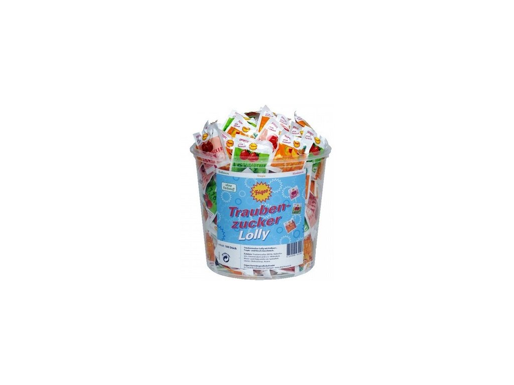 Lízátka z hroznového cukru s příchutí jahodovou, třešňovou a tropik. Složení: dextróza (hroznový cukr 89%), maltodextrin, kyseliny (kyselina citrónová a L(+)vinná), ztužený rostlinný tuk (řepkový), emulgátor (monoa diglyceridy mastných kyselin), glukózový sirup, aroma. Uchovávat v chladu a suchu. Výživové údaje ve 100g: energie 1593kJ/375kcal, bílkoviny 0g, tuky 1,7g, sacharidy 89g, vláknina 0g. EAN: 4033500101362Doplňkové parametry