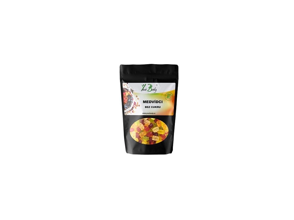 Jediné želé, které neobsahuje cukr! Medvídci bez cukru jsou totiž slazeni stévií. Chuťově jsou i přesto pěkně slaďoučcí a ani nepoznáte, že obsahují 0 % cukru! Pokud se snažíte omezit cukr nebo se mu úplně vyhnout, nemusíte si odpírat želé! Ochutnejte medvídky bez cukru a mlsejte bez výčitek! Složení: Sladidla (maltitol sirup, steviol glykosidy), voda, želatina, regulátor kyselosti: kyselina citronová, aroma, potravinářské barvivo (koncentrát ze spiruliny a světlice barvířské), koncentrát šťávy z černé mrkve, koncentrát z hroznového vína, barviva (kurkumin, paprikový extrakt), rostlinný olej kokosový, leštící látky (včelí vosk,karnaubský vosk). Nadměrná konzumace může vyvolat projímavé účinky. Výživové hodnoty ve 100g: energetická hodnota 203kcal/846kJ, tuky 0,2g z toho nasycené 0,2g, sacharidy 73,3g z toho cukry 0g, bílkoviny 6,3g, vláknina 0,5g, sůl 0,03g EAN: 8592355233278Doplňkové parametry