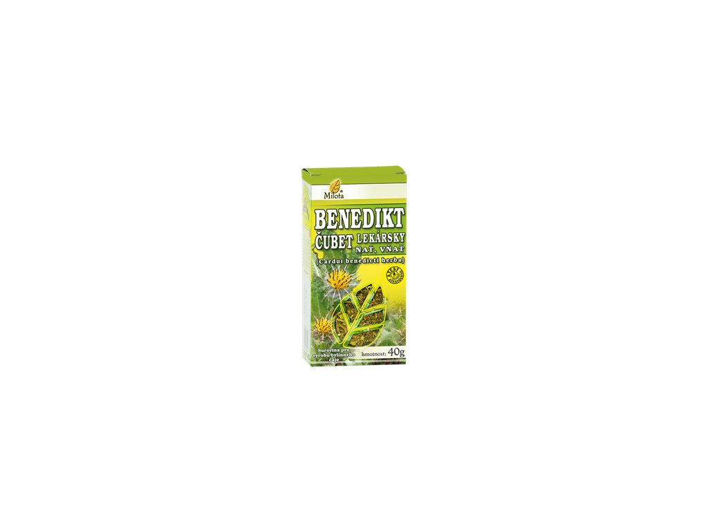 V lidovém léčitelství se Benedikt čubet používá vnitřně v nálevu jako stomachikum a amarum při špatném trávení, nadýmání a při onemocnění jater a žlučníku. Nálev benediktový se také užívá jako posilující prostředek při slabosti a nespavosti. Obsahuje hlavně hořčinu knicin, tříslovinu (8%), něco silice a relativně hodně slizu. Přiměřeně malé dávky působí příznivě hodně slizu. Přiměřeně malé dávky působí příznivě na žaludeční šťávy tím, že zvyšují žaludeční sekreci a povzbuzují žaludeční činnost. Větší dávky vyvolávají zvracení a dávení. Benedykt se užívá také jako prostředek celkově posilující. Má také antibiotické účinky, a proto se užíval k léčení brucelózy (nemoc zvířat přenosná na člověka). Benedykt působí také na některé nemoci vyvolané viry. Osvědčil se při pásovém oparu. Také známý jako choleretický a cholagogní účinek. Příprava: 1 čajová lžička na 200ml vařící vody, v zakryté nádobě luhujeme 20 min., potom scedíme. EAN: 8594056696406Doplňkové parametry