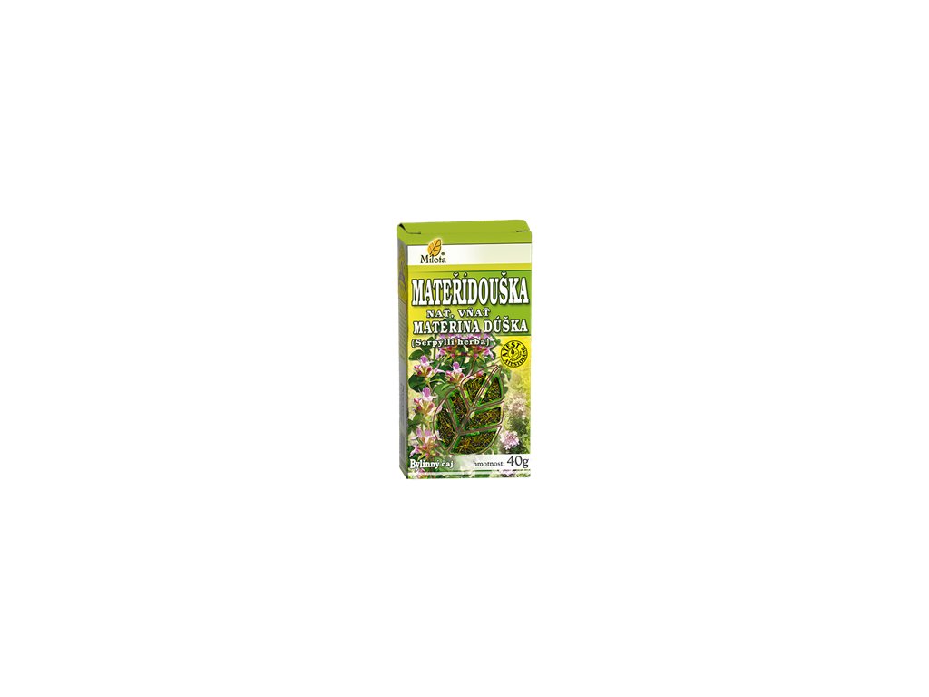 V lidovém léčitelství se používá k usnadnění odkašlávání a proti průjmu. Je vhodná při zánětech dýchacích cest a při dráždivém kašli. Rovněž se užívá při žaludečních a střevních poruchách, nadýmání a jako stavící prostředek. Pomůže i při křečích hladkého svalstva. Zevně se uplatňuje v obkladech nebo koupelích při hnisavých ranách. Mateřídouška obsahuje zejména monoterpenoidy (thymol, cymol, linalool, karvakrol a další) obsažené v silici (až 0,6%), dále kyselinu ursolovou, hořčinu serpyllin, třísloviny (asi 7%), flavony a fytoncidy. Thymol má velmi silné antiseptické účinky (bakterie ničící). Užívání: 1 čajovou lžičku na 2dl vařící vody, luhovat 10 minut. Popíjet 2 - 3x denně. EAN: 8594056690558Doplňkové parametry