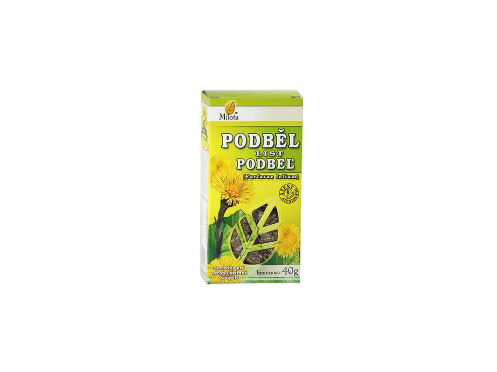 Podběl je typickou slizovou drogou. Květy obsahují flavonoidy, žluté barvivo xantophyl, malé množství silice, sliz, glykosidické hořčiny, třísloviny. V listu najdeme především sliz, dále obsahují slizovitý faradiol, hořčiny, třísloviny, kyseliny gallovou, mléčnou, jablečnou, vinnou, kávovou, dále polysacharid inulin, cholin, něco silice, cukry a hojnost minerálních látek, tanin, bílkoviny a fytosteroly, především zinek a draslík. Nejčastěji použitou formou je nálev připravovaný obvyklým způsobem a podávaný v běžných dávkách. Složení: Tussilago farfara folium. Užívání: 2 čajové lžičky na 2dl vody, luhovat 10 minut. EAN: 8594056693207Doplňkové parametry