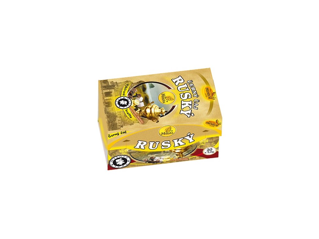 Čaj v Rusku se vyráběl v záp. Kavkazsku, kde je podnebí pro pěstování čaje nade vše příznivé. V Rusku se při přípravě čaje již od poloviny 18. století používá samovar - nádoba z nerez oceli nebo mosazi zahřívaná dřevěným uhlím. Za předchůdce samovaru lze považovat sbitennik. Sbitennik sloužil na přípravu nápoje, který se nazývá sbiten. Přirovnat se dá asi nejspíše k naší medovině. Složení: Černý čaj CTC. Příprava: Do čajové konvice vlijte trochu horké vody tak, aby bylo pokryto dno. Přidejte med, hřebíček a tyčinku skořice. Zahřívejte 7 minut. Přidejte čajové sáčky a zalijte vroucí vodou. Nechte čaj 5 minut stát. Podle chuti lze přidat citronovou šťávu nebo smetanu, popř. kondenzované mléko. Nalévejte tento silný chutný nápoj přes sítko do sklenice. Ihned podávejte. Ruský čaj se pije přes kostku cukru. EAN: 8594056696192Doplňkové parametry