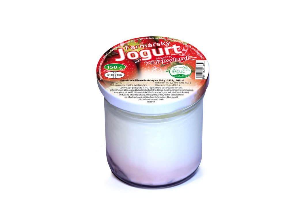Farmářský jogurt s jahodami. Výrobek k přímé konzumaci. Výskyt uvolněné syrovátky je důkazem použití přírodních surovin a není na závadu. BEZ LEPKU. Složení:80% jogurt (MLÉKO, jogurtová kultura Lactobacillus delbrueckii subsp. bulgaricus, Streptococcus salivarius subsp. thermophilus), kultura ABT, 20% ovocná složka (39,5% jahoda, sacharóza, voda, aroma, zahušťovadla (kukuřičný škrob, karubin), 4,9% koncentrát z mrkve, 0,6% koncentrát z jahody), regulátor kyselosti (kyselina citrónová, citronany sodné), sůl). Výskyt uvolněné syrovátky je důkazem použití přírodních surovina a není na závadu. Výživové údaje na 100g: energetická hodnota 335kJ/80 kcal; tuky 3,24g z toho nasycené mastné kyseliny 2,2g; sacharidy 10,3g z toho cukry 10g; bílkoviny 3,15g; sůl 0,1g EAN: 8594162160396 TENTO PRODUKT NELZE POSÍLAT PŘEPRAVNÍ SLUŽBOU, VYŽADUJE CHLAZENÉ PROSTŘEDÍ, ALE LZE VYZVEDNOUT NA PRODEJNĚ NEBO VYUŽÍT NAŠEHO ROZVOZU ŽĎÁR A OKOLÍ.Doplňkové parametry