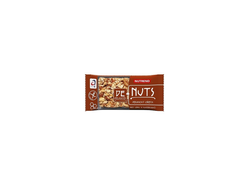 DeNuts je delikátní tyčinka vyrobená ze směsi vybraných ořechů a medu. DeNuts je vhodná jako zdravá svačinka kdykoliv během dne, je bez konzervantů a bez trans-nenasycených mastných kyselin. Složení: PEKANOVÉ OŘECHY 23%, ARAŠÍDY, VLAŠSKÉ OŘECHY, glukózový sirup, SEZAM, fruktóza, med 4%, emulgátor řepkový lecitin. Výrobek obsahuje alergeny pekanové ořechy, arašídy, vlašské ořechy, sezam. Výživové údaje na 100g: energetická hodnota 2491 kJ / 601 kcal; tuky 48,8g, z toho nasycené mastné kyseliny 4,8g; sacharidy 21,9g, z toho cukry 18,3g; vláknina 8g, bílkoviny 14,6g; sůl 0,03g EAN: 8594073177100Doplňkové parametry