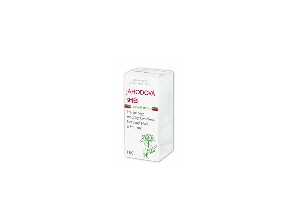 Jahodová směs - ledvinový písek a kameny, modřiny, nadměrná krvácivost Složení: Etanol max. 40%,voda, jahodník, rdesno, truskavec, bříza, zlatobýl, vrbovka, kopřiva, jehlice 50 ml Dávkování:2 lžičky do 2-3 dcl vody 3xD pro rozpouštění a navíc v polovině noci pro nerůst kameniva, protože šutry přibývají normálně jen v druhé půli spánku. Neužívat s léky na ředění krve. Nevhodné pro děti do 3 let EAN: 8594159131538Doplňkové parametry