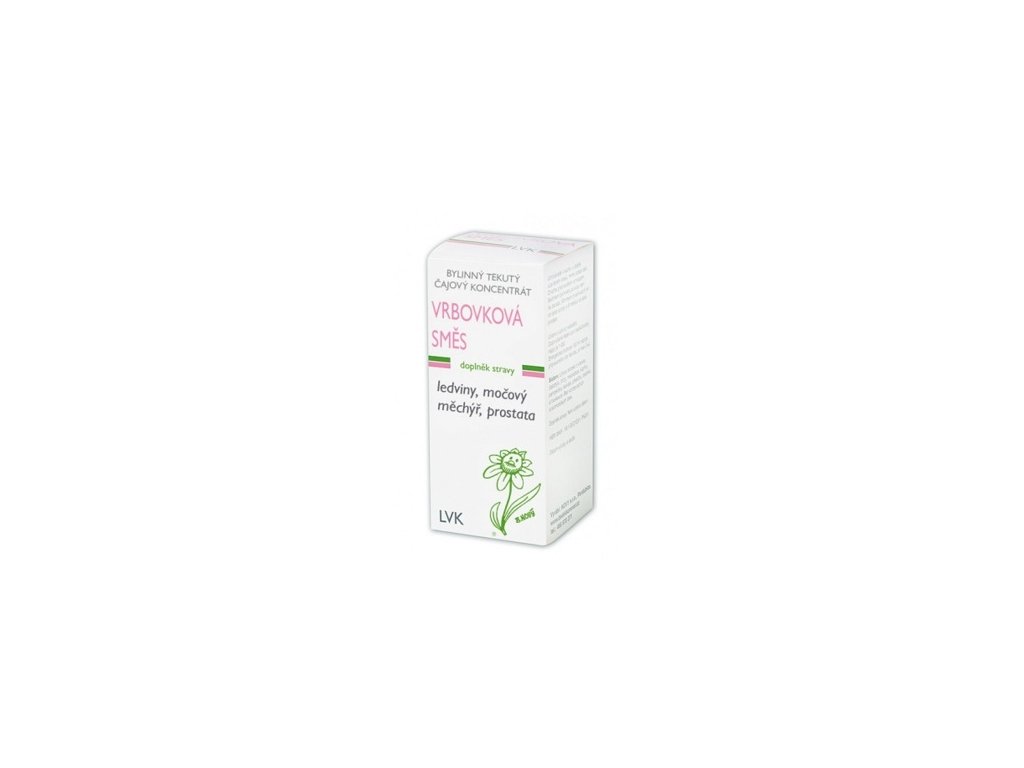 Vrbovková směs LVK - ledviny, močové cesty, prostata, močopudnost, akné Složení: voda, etanol, bylinný extrakt z vrbovky, břízy, kopřivy, zlatobýlu, medvědice, blešníku, truskavce, jehlice. Přídatné látky: voda, líh 45 % Dávkování: 1/2-1 čajovou lžičku rozmíchejte do šálku (100-250 ml) teplé nebo studené vody či slabého čaje. Nedoporučujeme používat vodu minerální ani perlivou. Podávejte 2-5x denně mimo jídlo. Doplněk stravy. Nevhodné určeno dětem do 3 let. Nepřekračujte doporučené denní dávkování. Není náhrada pestré stravy. Ukládejte mimo dosah dětí. Chraňte před světlem a mrazem. Sediment bylinného původu není na závadu. EAN: 8594159130883Doplňkové parametry