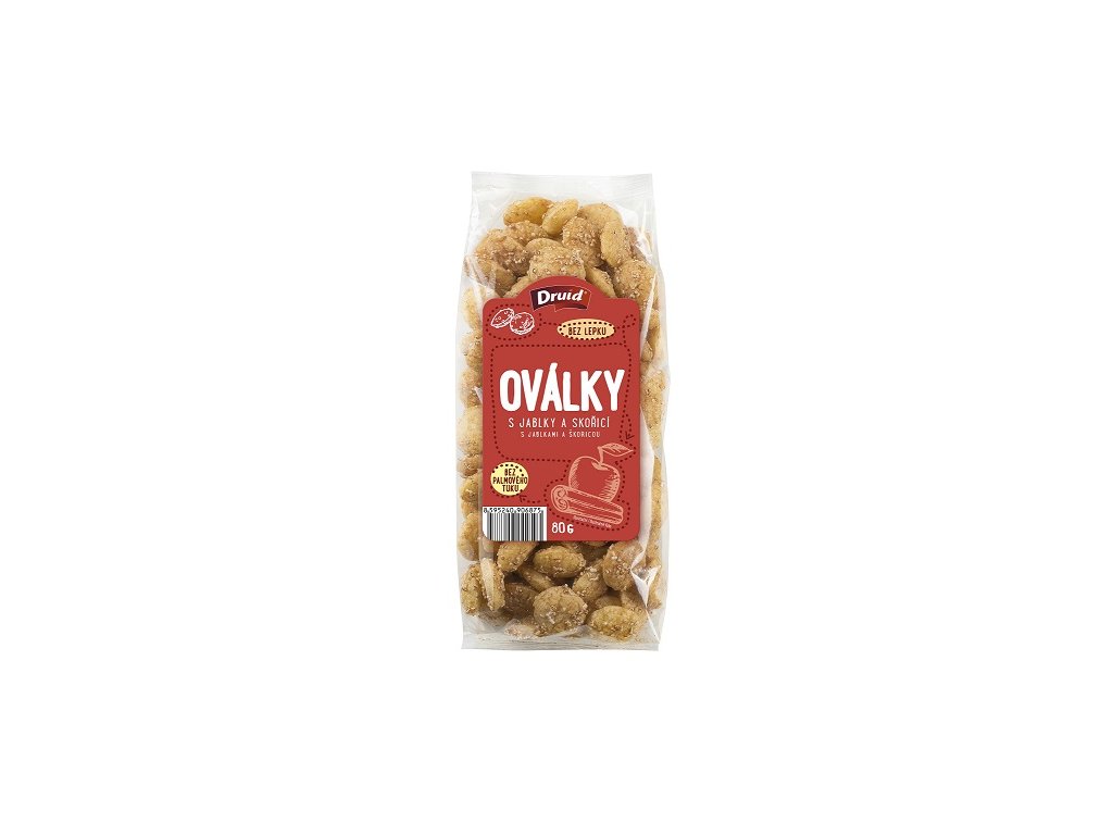Extrudát ve tvaru plochých pecek o průměru cca 25-30mm, obalené polevou, s nalepenými zrnky i ve hrudkách. Složení: extrudované oválky (kukuřice, zrno laskavce, rýže), maltózový sirup, třtinový cukr, čokoláda bílá (cukr, kakaové máslo, sušené mléko, sójový lecitin, vanilkový extrakt), Perličky (pufované zrno laskavce), kokosový olej, sušená jablka v prášku 3%, skořice mletá 1%, jablečný koncentrát 1%, kyselina citronová, aroma vanilka a citron. Výživové údaje na 100g: energie 1506kJ/359kcal, tuky 11g z toho nasycené mastné kyseliny 8,3g, sacharidy 56g z toho cukry 13g, bílkoviny 6,5g, vláknina 2g, sůl 0,03g. EAN: 8595240906875Doplňkové parametry