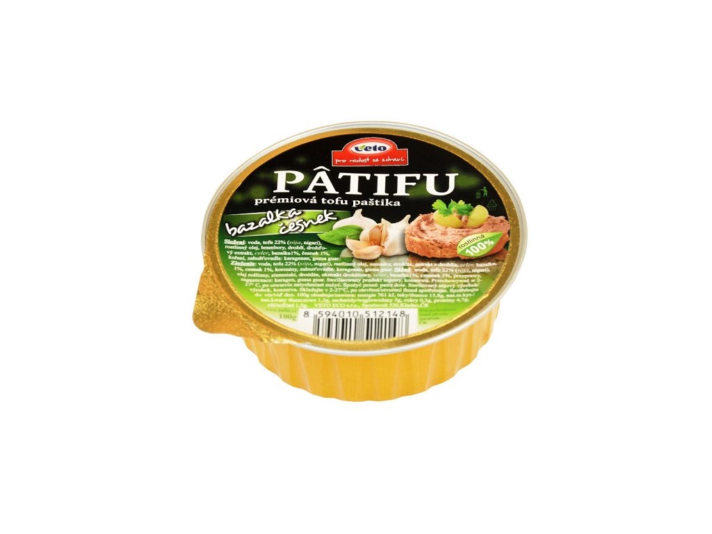 PATIFU paštika s česnekem a bazalkou je pomazánka rostlinného původu vhodná jak pro vegany, vegetariány, tak třeba pro celiaky nebo diabetiky. Je chutnou součástí zdravého jídelníčku jako náhrada masa. Navíc se jedná o český výrobek, který neobsahuje glutamáty ani konzervanty, a přesto se díky praktickému balení hodí na dovolenou, do práce nebo do školy. Složení: voda, tofu 22% (SÓJA, nigari), rostlinný olej, brambory droždí, drožďový extrakt, CELER, bazalka 1%, česnek 1%, koření, zahušťovadla: karagenan, guma guar. Výživové údaje na 100g: energetická hodnota 753kJ/180kcal, tuky 15g z toho nasycené mastné kyseliny 1,1g, sacharidy 5,4g z toho cukry 0,7g, bílkoviny 5,3g, sůl 1,3g EAN: 8594010512148Doplňkové parametry