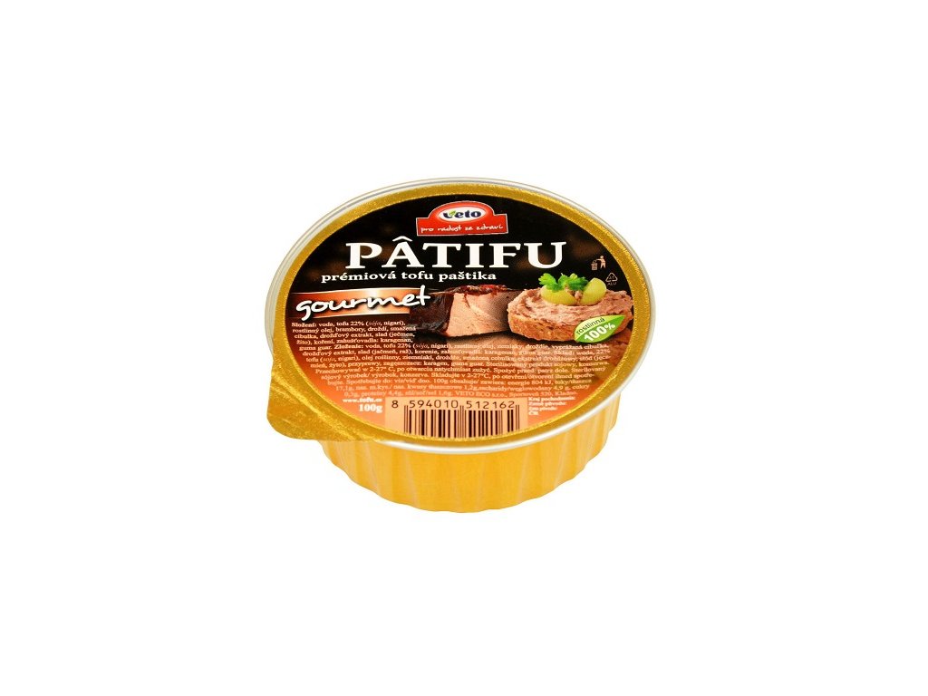 PATIFU paštika s příchutí gourmet je pomazánka rostlinného původu vhodná jak pro vegany, vegetariány, tak třeba pro celiaky nebo diabetiky. Je chutnou součástí zdravého jídelníčku jako náhrada masa. Navíc se jedná o český výrobek, který neobsahuje glutamáty ani konzervanty, a přesto se díky praktickému balení hodí na dovolenou, do práce nebo do školy. Složení: voda, tofu 22% (SÓJA, nigari), rostlinný olej, brambory, droždí, smažená cibulka, drožďový extrakt, slad (JEČMEN, ŽITO), koření, zahušťovadla: karagenan, guma guar. Výživové údaje na 100g: energetická hodnota 859kJ/205kcal, tuky 17,2g z toho nasycené mastné kyseliny 2,6g, sacharidy 7,4g z toho cukry 0,8g, bílkoviny 4,9g, sůl 1,5g EAN: 8594010512162Doplňkové parametry