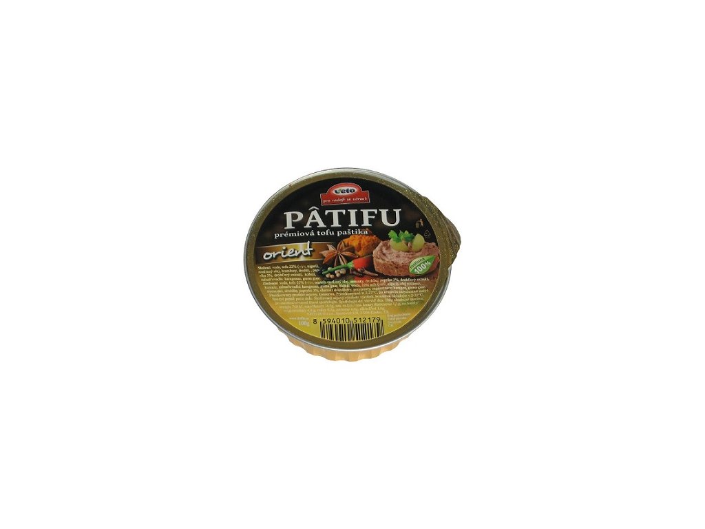 PATIFU paštika s příchutí orient je pomazánka rostlinného původu vhodná jak pro vegany, vegetariány, tak třeba pro celiaky nebo diabetiky. Je chutnou součástí zdravého jídelníčku jako náhrada masa. Navíc se jedná o český výrobek, který neobsahuje glutamáty ani konzervanty, a přesto se díky praktickému balení hodí na dovolenou, do práce nebo do školy. Složení: voda, tofu 22% (SÓJA, nigari), rostlinný olej, brambory, droždí, paprika 3%, drožďový extrakt, koření, zahušťovadla: karagenan, guma guar. Výživové údaje na 100g: energetická hodnota 801kJ/191kcal, tuky 15g z toho nasycené mastné kyseliny 1,2g, sacharidy 8g z toho cukry 3,2g, bílkoviny 5,1g, sůl 1,9g EAN: 8594010512179Doplňkové parametry